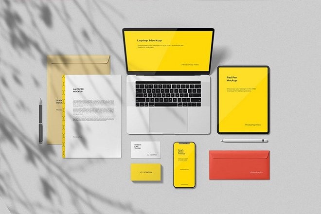This is the perfect branding mockup you can use to showcase branding stationery designs for a digital agency. Since it comes with multiple device mockups alongside the stationery, you can easily showcase digital aspects of the brand identity using this same mockup template. It includes editable shadows and changeable backgrounds as well.