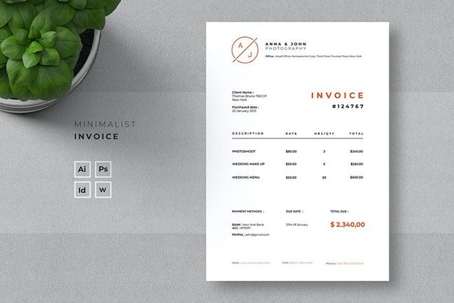 If you’re working on an invoice design for a high-end or luxury brand, this template is perfect for you. It features an elegant and stylish design that will fit in perfectly with jewelry, fashion, and many other types of brands. You can edit the template with Word, Photoshop, and Illustrator.