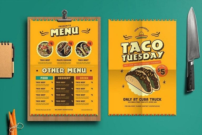 If you’re working on designing a menu for a food truck, this template will come in handy. It comes in 2 color versions and features a playful and a fun design.