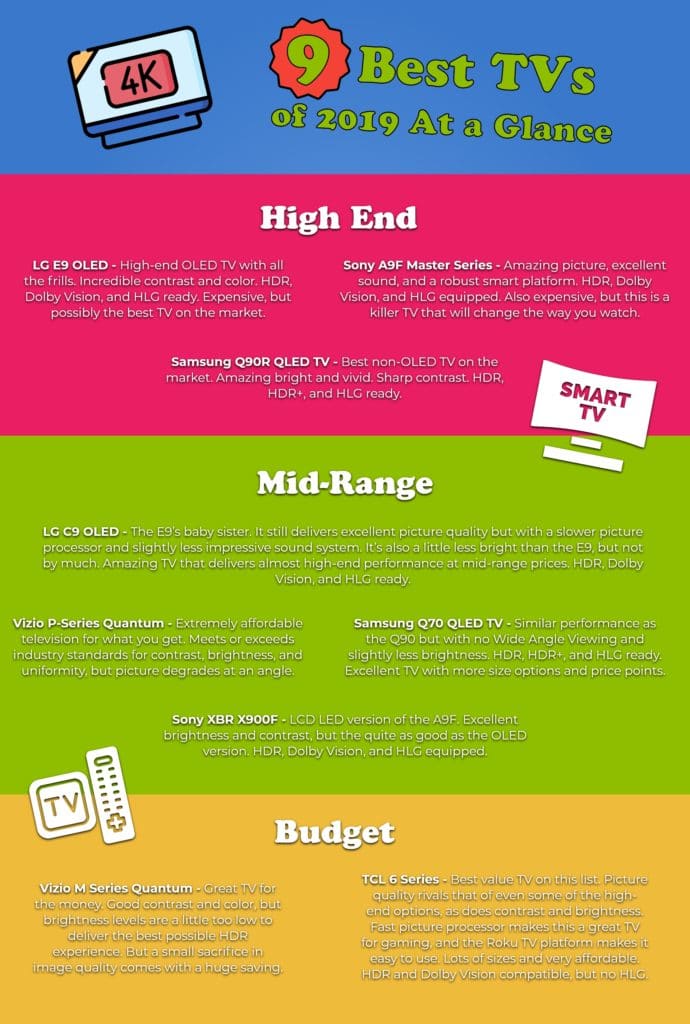 Below you will find a detailed guide of what to look for in a great TV, as well as in-depth reviews of each of the models we have chosen for our list. But to get you started, here’s a rapid-fire breakdown of the TVs that earned a spot on our list of the 9 best TVs of 2019: