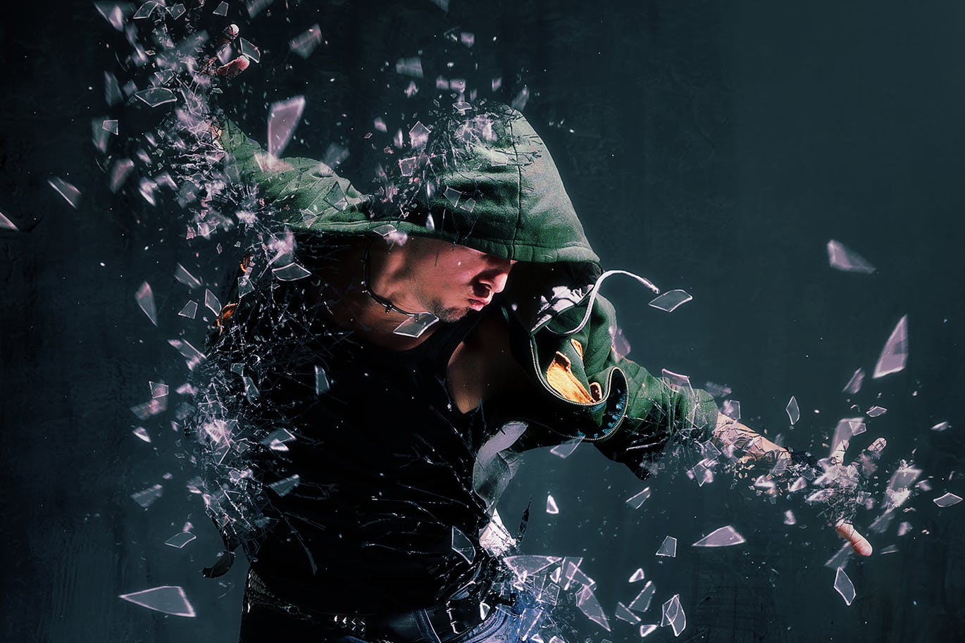 This is an effect you mostly see in video game and movie related promotions. This Photoshop action makes that effect look even better. The action uses lots of particles with different sizes to achieve a realistic broken glass effect.