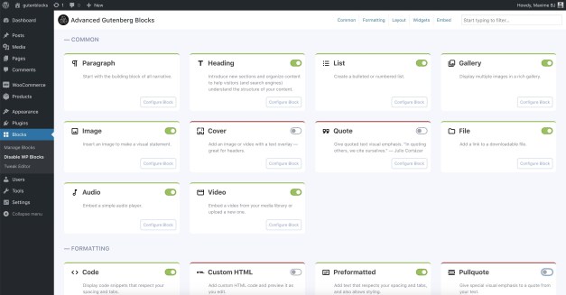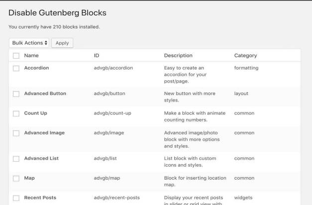 A few block collections have also implemented their own block management features, including Advanced Gutenberg Blocks and CoBlocks. Advanced Gutenberg Blocks adds a screen under its own top level menu for disabling blocks.