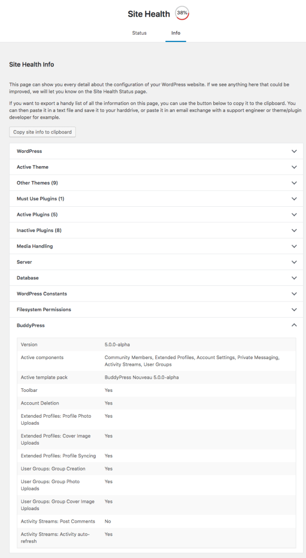 The upcoming BuddyPress 5.0 release will add plugin-specific debug info to the new Site Health Info screen that is coming in WordPress 5.2.