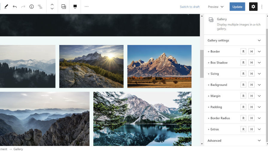 Editing a Gallery block’s background and padding.