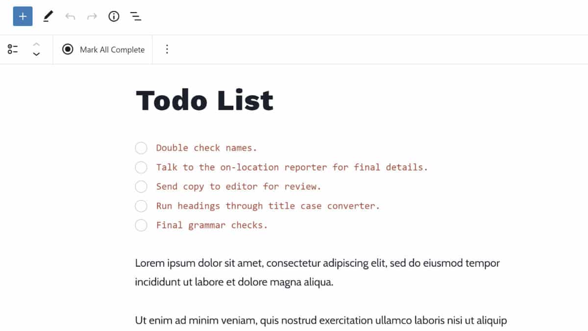 My initial interest in the Todo List Block plugin was its similarity to checklists (also called task lists). Essentially, these are unordered lists with a checkbox input for each item.