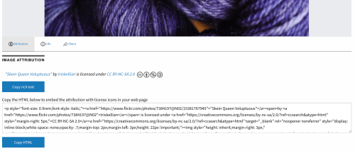 This update to CC Search also improves attribution options, making it easy for users to copy the text or HTML with the license icons included. Each image also has a unique link for users to provide optional feedback on how they using the works.