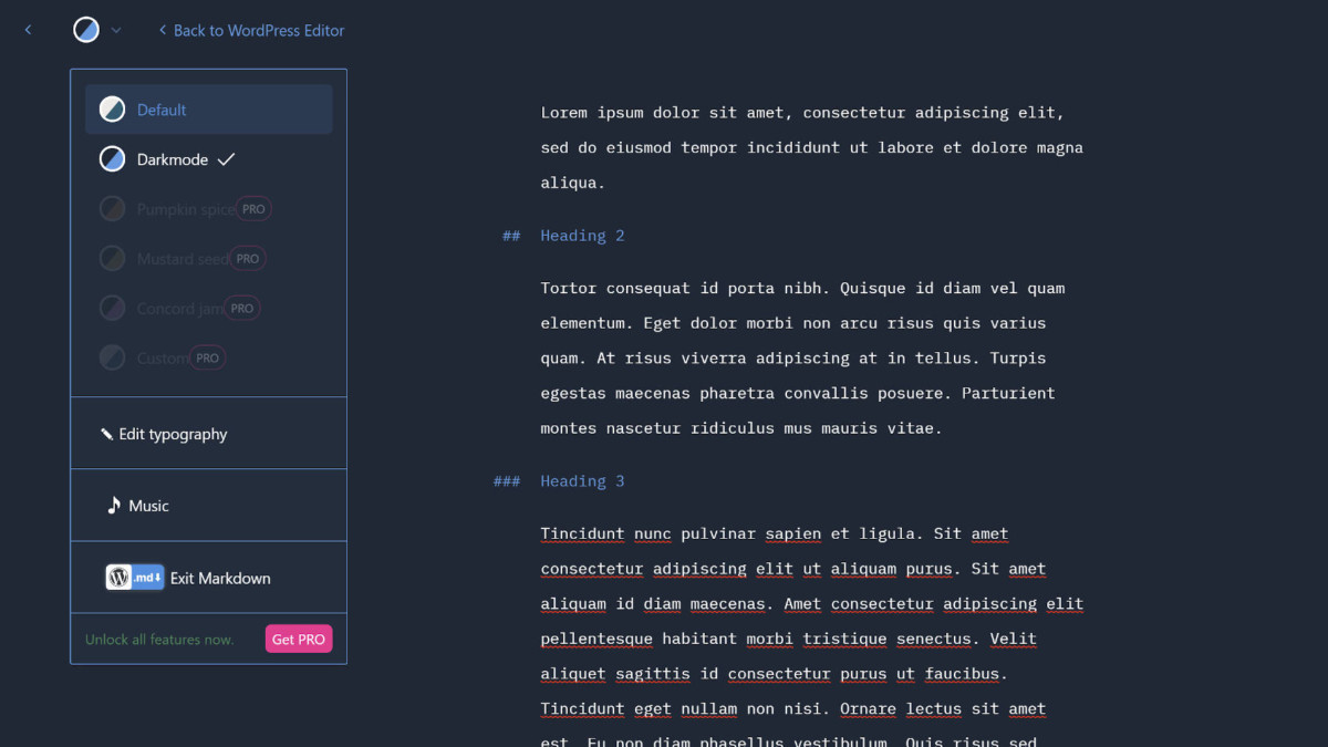 Fast forward a few months, and Dark Mode had not only changed owners, but it also had a new name and set of features unrelated to the plugin’s original promise. The plugin is now named WP Markdown Editor and bundles at least part of the commercially available Iceberg Editor plugin. It is also a limited version in which users are prompted to upgrade for the complete feature set.