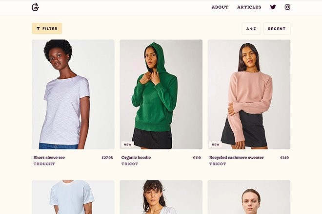 Good Garms, above, uses subtle animation with each card that shows another view of the product. This use of cards helps streamline clutter for product information and allows shoppers to see more items at once and compare them on-screen.