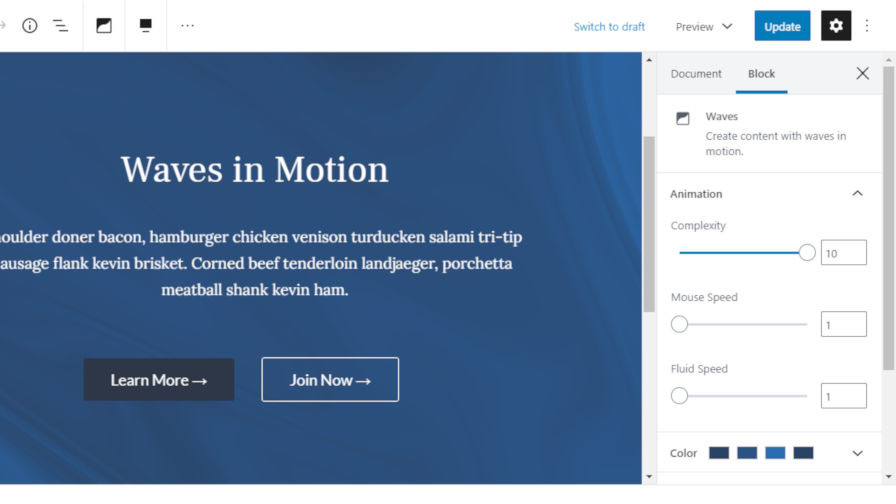 Similar to Starscape Block, the Waves Block plugin creates a container block with a moving background. Instead of stars, the background is made up of — you guessed it — waves. It is not a simple copy of a plugin that does the same thing. The Waves block is a more robust solution. It works almost the same as the core Cover block and allows other blocks nested inside.