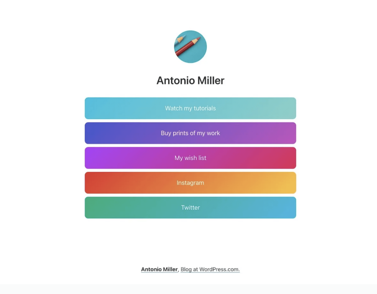 By building a custom Social Links Page in your WordPress.com site, you have full control over the layout and design; this includes the simplicity or complexity of the look and how many links you want on the page.