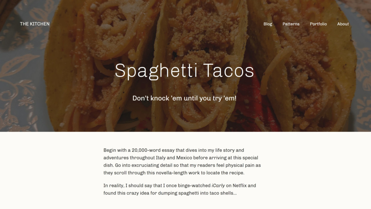 I had fun with this testing round. Recipes are my jam, so I had to pick the perfect one to share. Ultimately, I built a custom “recipe template” and a faux recipe post, as shown in the following screenshot: