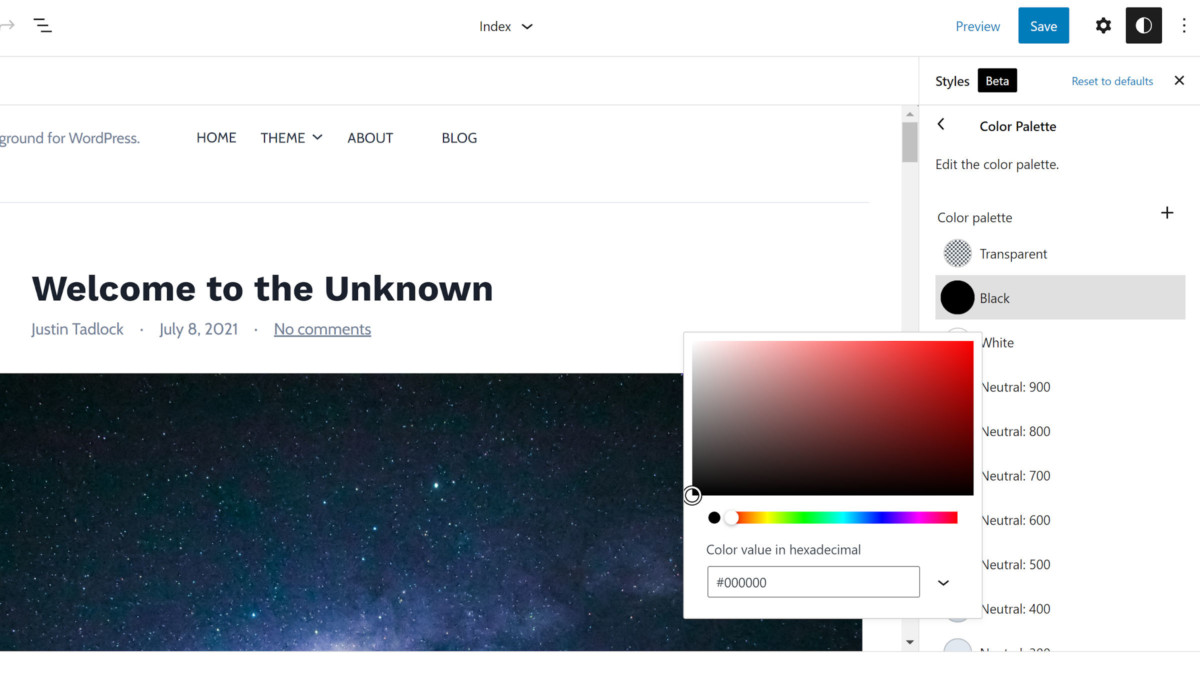 After opening the palette section, users can edit the theme-defined colors or click the + icon to create new ones. These colors will all show up as options in the block and site editors.