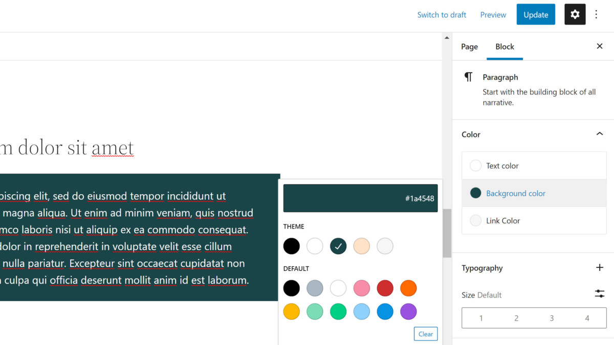 Color picker popup.Gutenberg 12.2 introduces a much-improved color picker. The previous iteration was unwieldy, bulky to the point of being an annoyance. Users would have to scroll and scroll and scroll some more just to jump between changing a block’s text color and its link color. This was especially true if the theme showed both its colors and those from core.