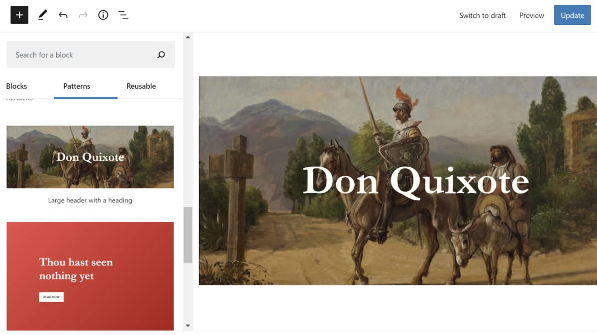 The “large header with a heading” pattern dropped the blinding background gradient and replaced it with an image. The “quote” pattern now has a face instead of an impersonal icon. Even the “two images side by side” pattern fits in thematically.