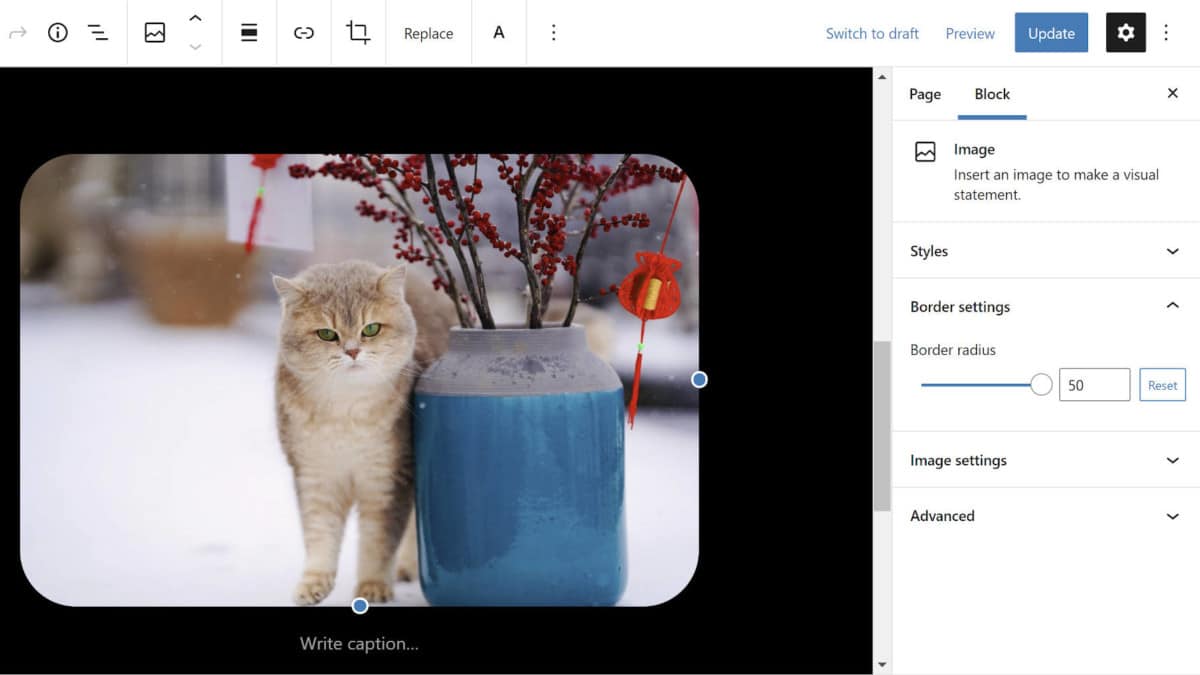 Theme authors can now opt into border-radius support for images. Support comes in two forms. One is a setting to allow end-users to customize the border-radius via the block options sidebar. The second is setting a default border-radius value for all images.