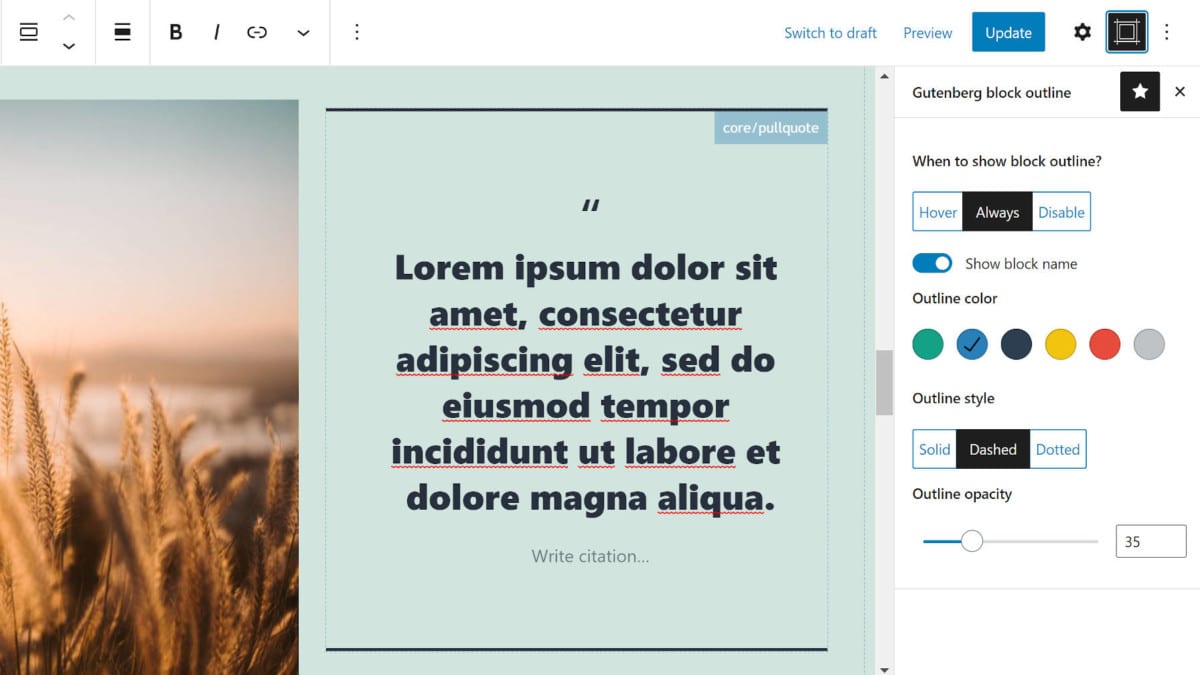 Of course, there are ways around that, such as using the navigation tree, breadcrumbs, or keyboard commands. However, the block editor is meant to be a visual interface that allows end-users to simply point and click on the elements they wish to edit. Selecting specific blocks has generally improved over time, but users still run into issues. Editor Block Outline makes it a much simpler affair.