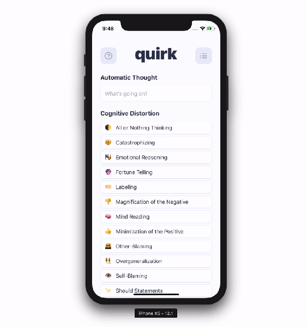 Quirk lets users record a quick thought and will automatically narrow down a list of potential ways these thoughts are distorted. The distortions were inspired by the ones popularized in Feeling Good: The New Mood Therapy. The user is then invited to challenge those distortions and write an alternative thought.
