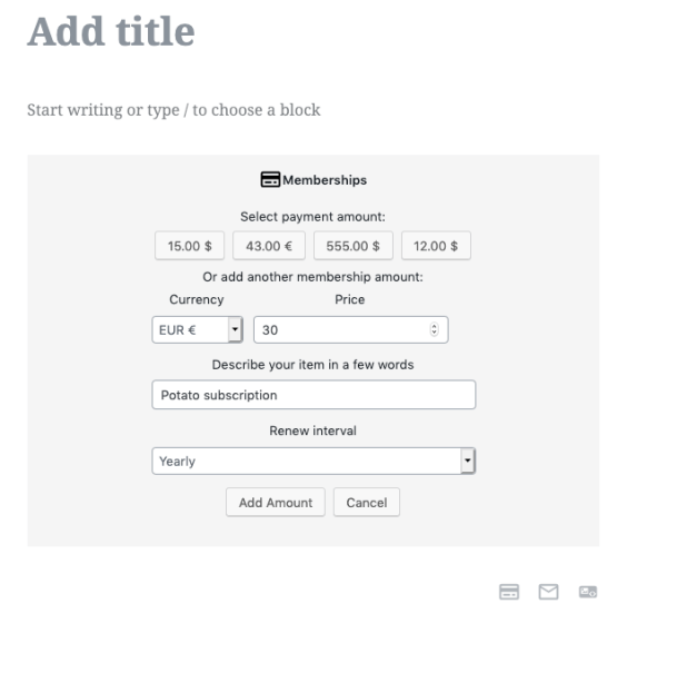 Users will be able to set the currency, price, product name, and renewal interval directly within the block.