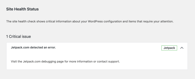 The new version also integrates with WordPress 5.2’s new Site Health checks. It includes a status check and moves Jetpack’s legacy debug data to a section in the new “Site Health Info” tab. The initial status check isn’t very descriptive regarding critical errors, but these error messages can be improved in future iterations so users know how to get to a page with more information.
