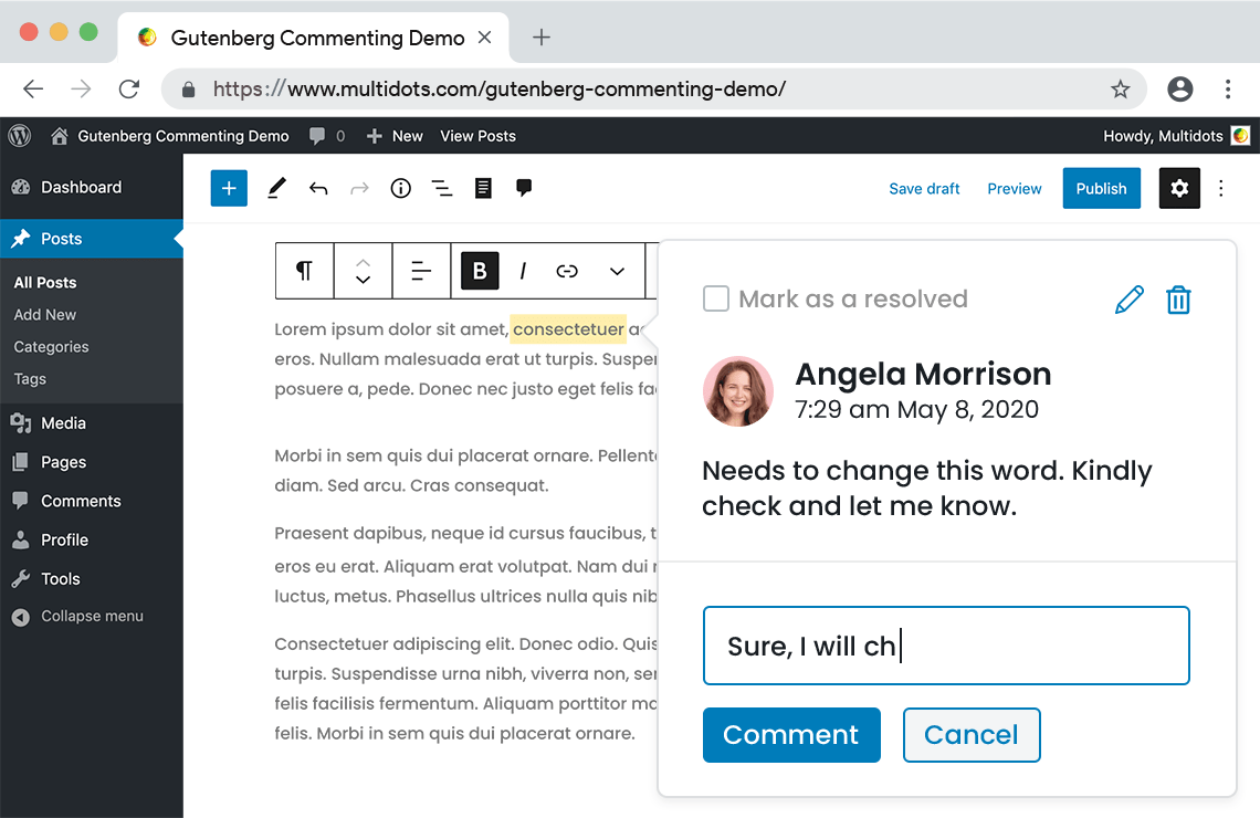 It adds inline commenting to the editor where users can highlight text or select entire blocks and leave a comment. Other users can leave comments and/or mark the thread as resolved for a collaborative editing experience. Alternatively, the post author can use comments for making notes on sections that need to be improved or reviewed prior to publishing. The features support the following editorial workflow: