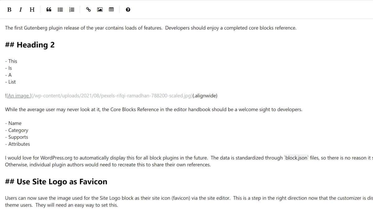 While I am generally a fan of option-less plugins, this one could use a few. At the very least, users should get to choose which editor they prefer via their profile. On a multi-author site like the Tavern, not having this option means the plugin is a non-starter. I would also like to choose between editors for individual posts. It does not make sense for one already written in blocks to be edited in Markdown.