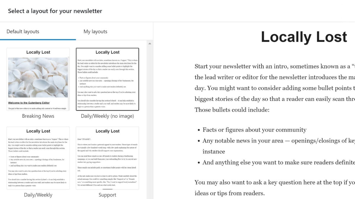 The plugin adds a new post type for managing newsletters. It works much the same way as any other post or page. When adding a newsletter, users are initially presented with four layout options: