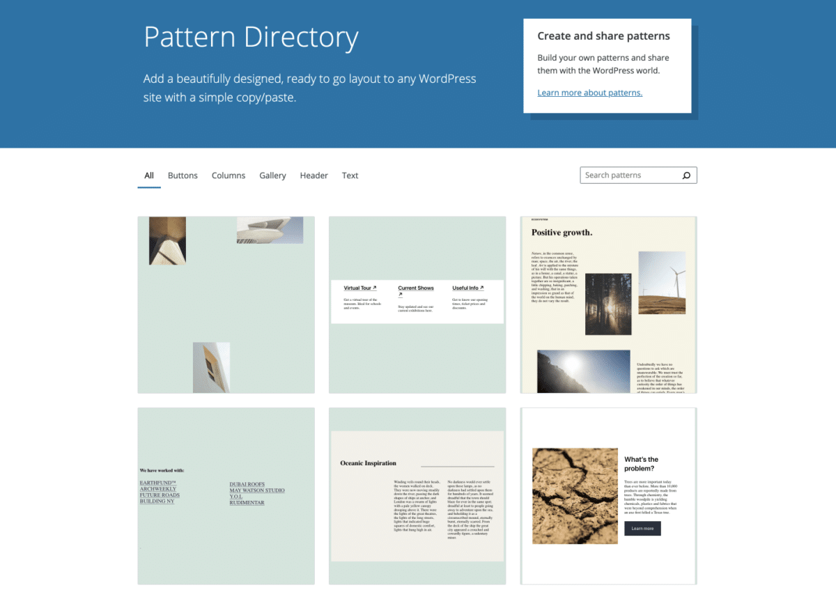 The project is clipping along and contributors are aiming to have the new directory ready to launch in tandem with the upcoming WordPress 5.8 release. Features planned for the first version include browsing and searching patterns, live preview of patterns, and the ability to copy the block code. Users signed into WordPress.org will be able to create and submit patterns to the directory using a set of curated images and media. They will go through a basic moderation process and patterns will be available for download directly through the block editor.