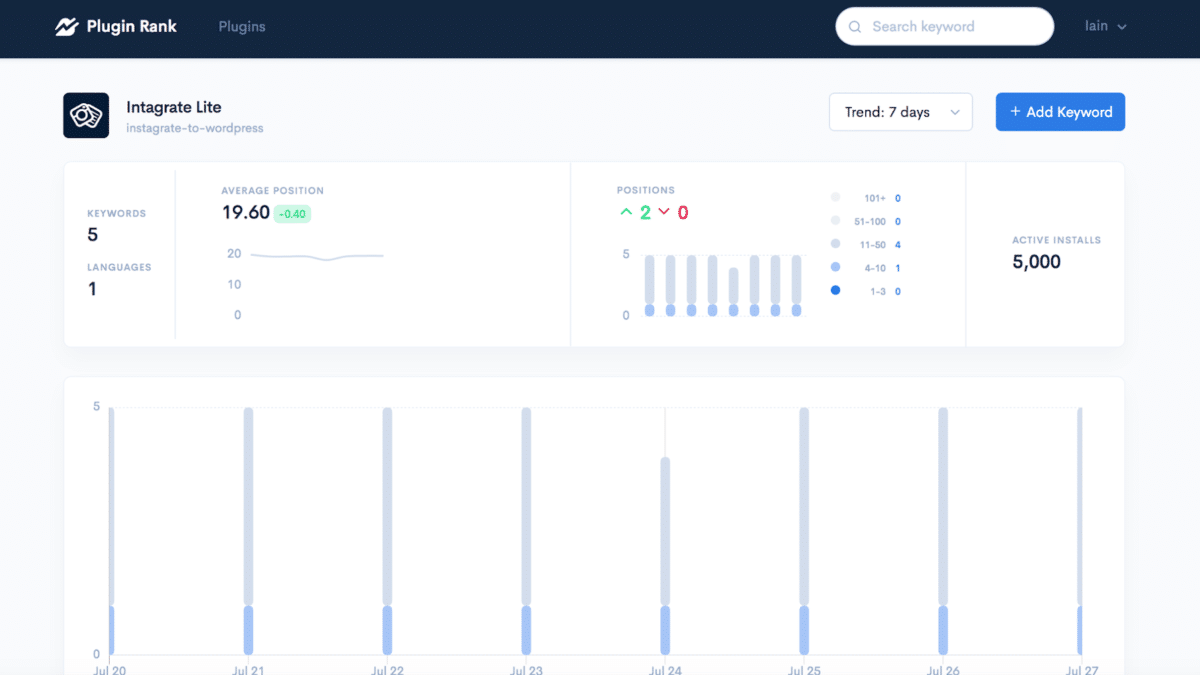 “Plugin Rank will check the API daily to find the latest positions of the plugins for the keywords being tracked by Plugin Rank customers,” he said. “This data is then used to show position movement and charted to show an overall picture of how the plugins are ranking.”
