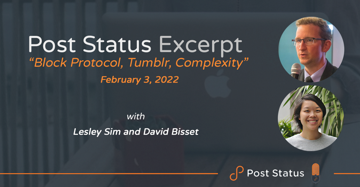 In this episode of Post Status Excerpt, David talks with Lesley Sim about Joel Spolsky on the Block Protocol, Matt Mullenweg for taking over for the exiting CEO of Tumblr, and a blog post by Dan Devine entitled “The Complicated Futility of WordPress.”