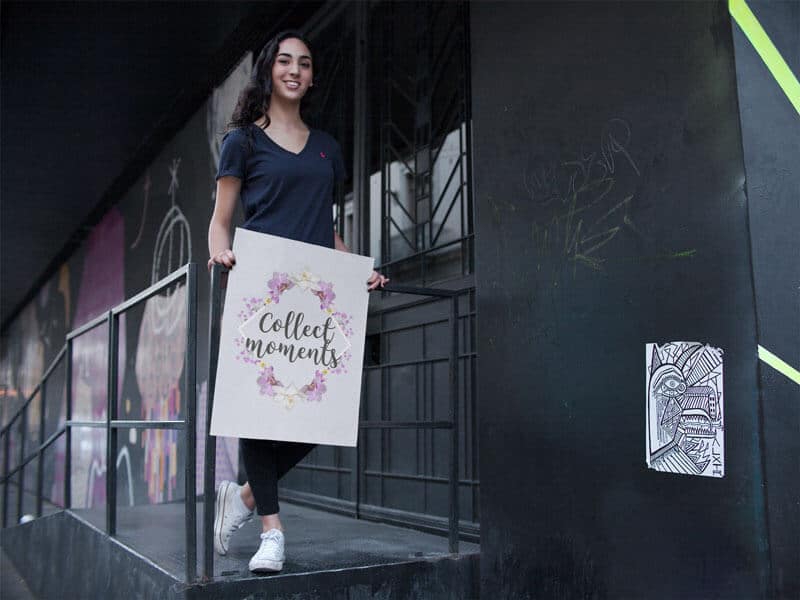 Start showcasing your awesome designs with beautiful visual assets. Start now with this mockup of a cool girl holding a poster while in the street, it’s an excellent option for you to display an urban environment. All you need to do is drag-and-drop your image design on the interface, we will process it in just seconds. That’s right, that’s all the work you have to do here. Isn’t Placeit great?