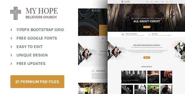 My Hope Church PSD template With the complete package you have a wide range of possibilities to design almost any kind of personal and professional web layouts.