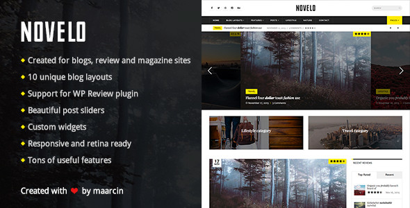 Novelo is responsive, clean and modern-looking WordPress Theme for blog, magazine and review sites. Theme comes with 10 blog layouts that can be easily changed and modified with WordPress Customizer. It’s fully responsive and works and looks great on mobile devices and desktops. It can be easily adapted to personal blogs, magazine or review sites. Options with live preview gives you the power to customize your blog with just couple clicks of the mouse. That and more is build with best code and SEO practices in mind. Fully supports plugins like WP Review, Contact Form 7, MailChimp for WordPress, Yoast SEO or multiple page builder and shortcode plugins.