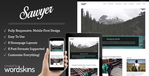 Sawyer is a minimal responsive multipurpose theme from WordSkins that can be used for blogging, magazine and personal sites. Clean and simple, Sawyer let’s your content do the talking. With 8 supported Post Formats, whether it’s articles, music, videos or photo galleries, Sawyer helps your work shine!