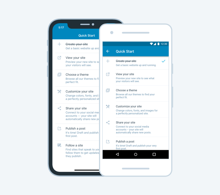 Quick Start is part of the WordPress for Android app (version 10.8 or higher) and WordPress for iOS (version 11.1). If you’ve got an iPhone, iPad, or Android device and have been thinking of launching a new site, this is the time to take the plunge!