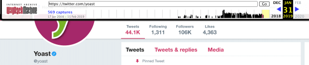 After the tweets and videos began circulating on the #YoastCon hashtag, the @yoast Twitter account was quietly scrubbed of potentially offensive tweets. The total tweet count for the account was 44.1K on January 31, 2019.